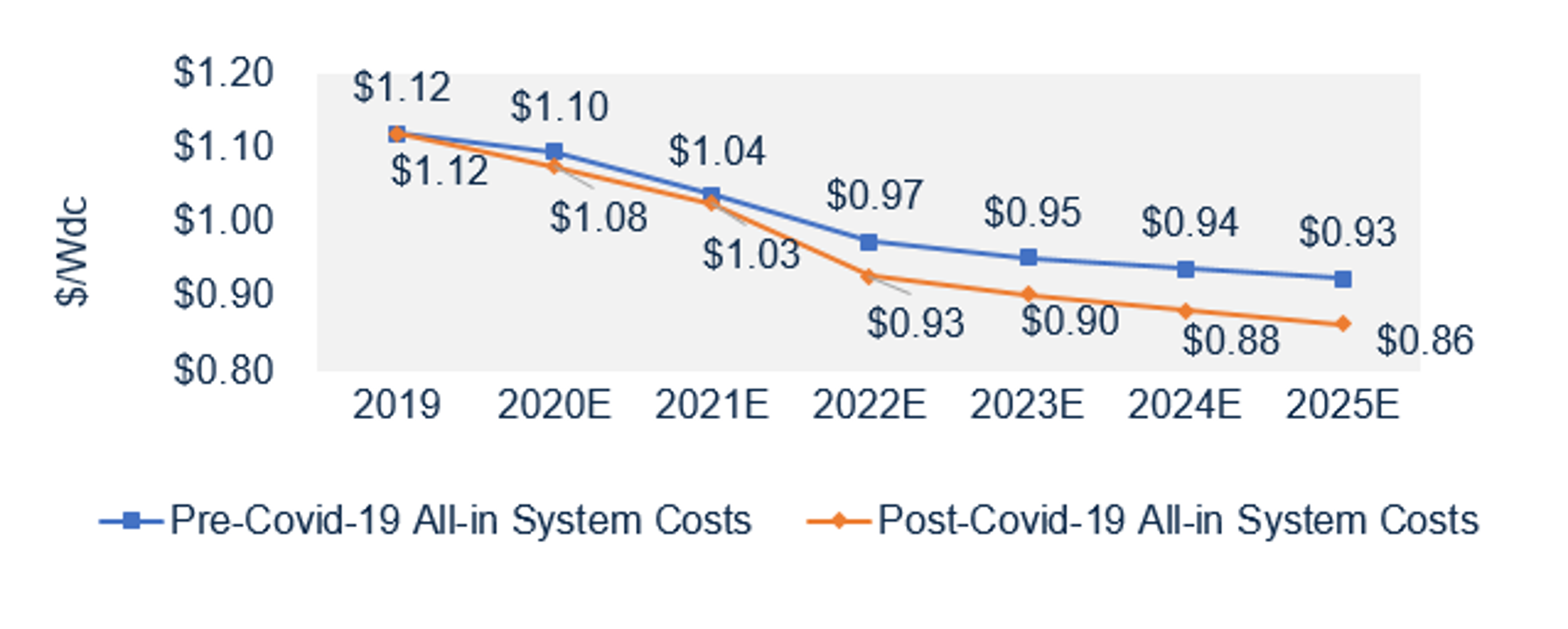 US utility tracker 10 MW PV system costs, pre- and post- Covid-19, 2019 – 2025E